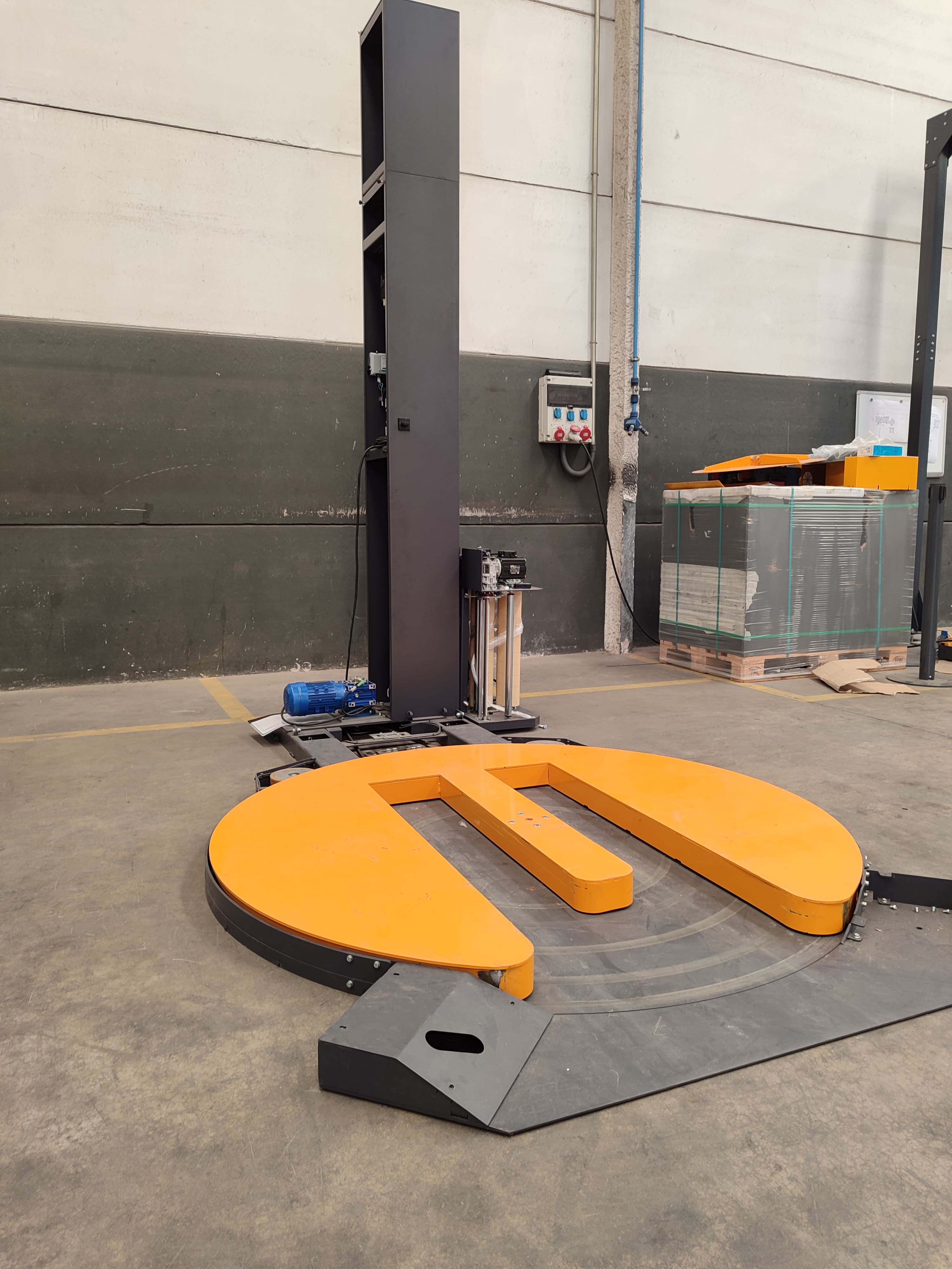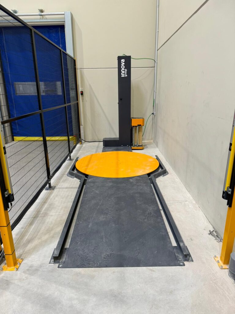 Essa flexibilidade não apenas permite enfardar paletes de maiores dimensões, mas também pode representar uma importante economia na instalação. De acordo com a norma UNE-EN 415-6:2014, relativa à segurança em máquinas de embalagem, quando a carga ultrapassa a plataforma giratória, é obrigatório incorporar um cercamento perimetral de segurança, o que aumenta significativamente o custo do projeto. Ao utilizar uma plataforma de maior tamanho, que se ajuste completamente à carga, evita-se essa necessidade e otimiza-se tanto o investimento quanto o espaço de trabalho.