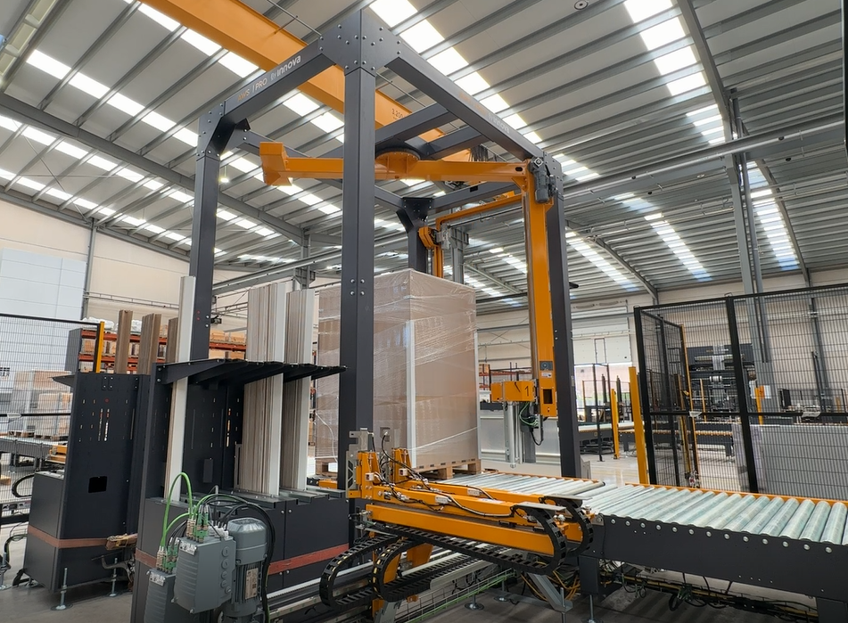 A partir da Innova, apresentamos o sistema aplicador de cantoneiras agora integrado na envolvedora automática de braço, que até o momento só estava disponível para os sistemas de cintagem e para a envolvedora de anel. Ele permite combinar a eficiência do enfardamento automático com uma proteção adicional nos cantos do pallet, sem necessidade de processos externos nem intervenção manual.