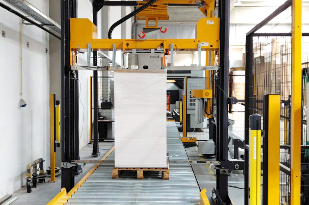 O primeiro passo da linha é a cintagem vertical automática, destinada a garantir a união entre a carga de cartolina e a base do palete. Graças a esta aplicação, obtém-se uma maior estabilidade e compactação, essenciais para evitar deslocamentos ou deformações durante o transporte.